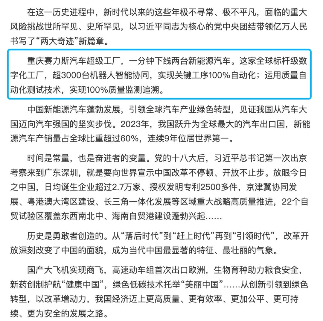 文中这样写道:重庆赛力斯汽车超级工厂,一分钟下线两台新能源汽车。这家全球标杆级数字化工厂,超3000台机器人智能协同,实现关键工序100%自动化;运用质量自动化测试技术,实现100%质量监测追溯。